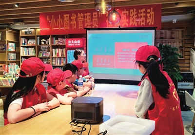 7月8日,新华书店开展“小小图书管理员”社会实践活动,让小志愿者在工作岗位上学会合作和协调,互助和理解,从小培养为社会服务的公益意识和良好的阅读习惯。图为工作人员向小志愿者们介绍新华书店的基本情况、服务内容及规范、志愿者工作职责等内容。