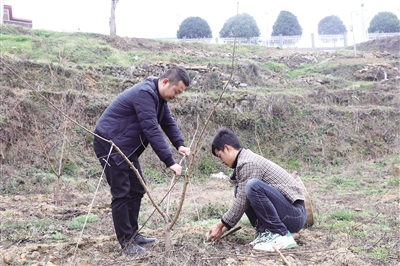 3月6日,在绍庆街道天台村桃树种植基地,村民们正忙着进行田间管理,为桃树压枝,为今年丰产丰收打牢基础。据了解,近年来,天台村利用村产业发展资金成立生态农业公司,流转400亩土地,种植鹰嘴蜜桃和黄桃,壮大村集体经济的同时为村民增加增收渠道。