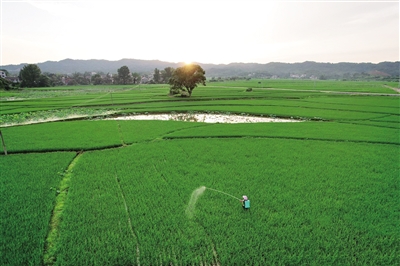 近日,在江西省抚州市广昌县,3.4万多亩早稻正逐步进入分蘖期,稻田里绿油油一片,禾苗根壮、长势喜人。农民正忙着喷洒农药,进行防治病虫害作业,为夏粮丰产丰收打下基础。