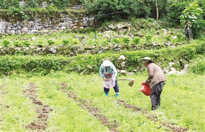 近年来,靛水街道文武社区坚持党建引领,围绕产业振兴目标,积极创新工作思路,探索多元化发展模式,盘活土地资源引导村民发展特色产业,持续推进群众稳定增收。图为近日,村民在中药材基地里套种晚熟糯玉米。