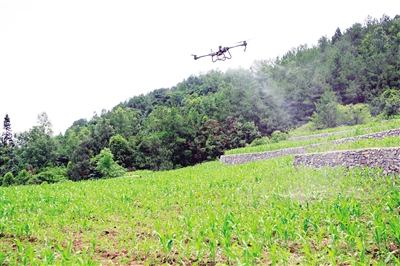在田埂上,彭水苗乡农业服务公司无人机操作员梁涛,正拿起遥控传感器,盯住智能显示屏,按下起飞按钮,植保无人机随着操作员的指令腾空而起,疾速向农田飞去……随着螺旋桨的转动,机身下的喷淋头喷出白色的雾化农药,均匀地喷洒在农作物上。