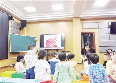 “如果你是现在的蚂蚁,你会怎么办呢?”穿着黑色T恤、白底黑花裙的杨老师指着屏幕上一块大大的西瓜问教室里的小朋友。