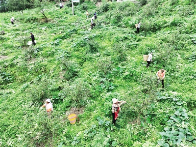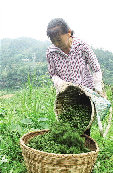 6月27日,在汉葭街道长滩社区,居民李国章正组织10多位村民采收花椒。“现在是采收花椒的关键时节,趁着天气好,大家都在忙着抢收。”李国章是土生土长的长滩社区居民。2017年,看到当地大多青壮年外出务工,当地撂荒地越来越多,李国章就萌生了通过发展产业,盘活土地资源,带领更多人致富的想法。李国章考察过多个产业,想到增收的持续性和带动乡亲们共同致富的稳定性,结合当地的土地条件和海拔,他决定发展花椒产业。“我们基地通过流转土地,种植了800亩花椒,已经实现丰产。预计今年鲜花椒能生产20吨,加工成干花椒3吨,产值在120万左右。”李国章说,随着基础设施的不断完善,合作社在逐渐扩大种植规模的同时,围绕花椒产业,开发了花椒油、鲜花椒、花椒枕头、花椒腊肉等产品,通过深加工进一步提高花椒种植的收益。