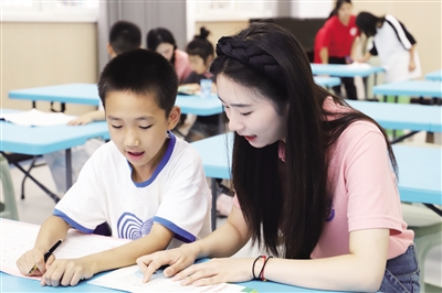 7月12日,重庆人文科技学院“心系民族情·推普助乡兴”暑期三下乡实践团队来到县青少年活动中心开展普通话推广活动。活动中,实践团队的学生通过游戏、绕口令等趣味互动,提升孩子们对普通话的兴趣,帮助孩子们树立讲好普通话的意识。图为学生指导孩子们普通话发音。