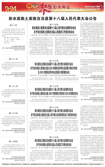 彭水苗族土家族自治县第十八届人民代表大会第四次会议听取和审议了县人大常委会主任彭玉萍同志所作的县人大常委会工作报告。会议充分肯定县十八届人大常委会2023年的工作,同意报告提出的2024年工作建议,决定批准这个报告。