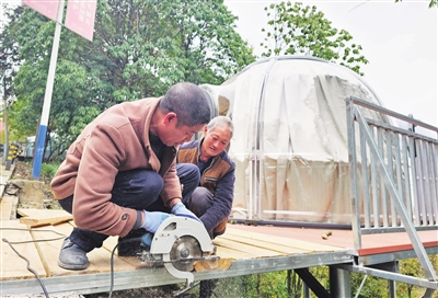 近日,在石盘乡石新村6组,星空民宿项目正加紧施工。据了解,石新村充分发挥地域优势,大力推进乡村旅游,为游客提供赏景、品茶、休闲娱乐的理想场所,并计划拓展茅草屋和林下休闲项目,打造全新的生态旅游体验。