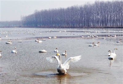 近日,大批天鹅飞临河北省唐山市曹妃甸区第五农场,在这里栖息、觅食,成为春季一道靓丽风景。