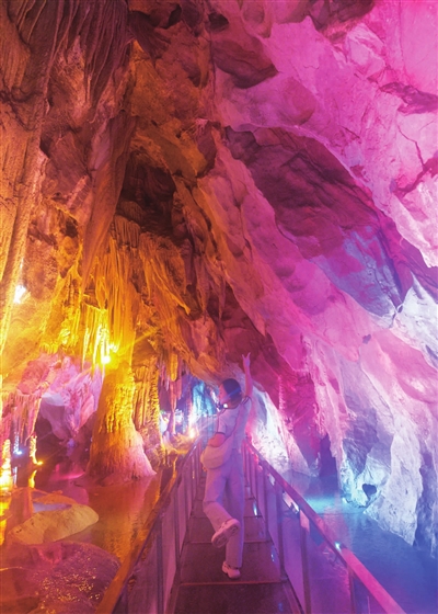 顺着游玩路线往下走,便到了下半程漂流的起点 —— 牛角寨。这座风情独具的苗寨,把木楼建在山水之间,青瓦木梁透着古朴韵味。走累了,在这里歇脚再合适不过:卸下旅途的劳顿,补充好体力,为接下来的刺激旅程蓄力。若想探索别样风光,可乘电瓶车或徒步前往青龙洞,溶洞里的钟乳石、石笋、石花形态万千,在灯光的映照下宛如奇幻世界,洞内恒温的清凉更是让人舍不得离开。