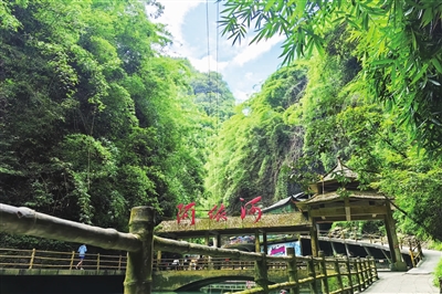步行来到竹板桥码头,游客在这里可以体验竹筏放歌,碗口粗的楠竹扎成的竹筏静候岸边,载着游客观赏漫山摇曳的绿,感受绿水清幽,两岸迷人景色尽收眼底,岩壁上的翠竹、未消散的雾气笼罩在河上,仿若仙境,人在筏上坐,筏在画中游,暑气早已被这诗意与清凉冲散。