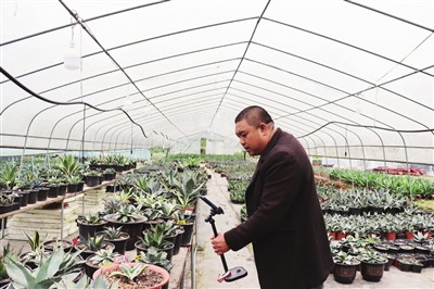 从最初几盆绿植试种,到如今1万余盆龙舌兰、丝兰等观赏植物成规模培育,张健康摸索出了“庭院育苗+线上销售”的模式:每天清晨先给绿植浇水、修剪枯叶,有空的时候就打开抖音直播,也在淘宝销售。张健康的镜头对着苗圃里的幼苗,一边展示养护过程,一边回应网友关于品种、价格的咨询。