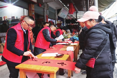 无独有偶,早在1月29日,保家镇清平社区利用赶集日,在场镇组织开展了“义写春联送祝福·翰墨飘香迎新春”主题活动,邀请本土书法爱好者现场挥毫,免费为居民书写、赠送春联与“福”字。